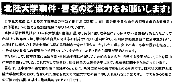 今回は、右ページに貼り付けた「私大教連NEWS LETTER」の記事のように、北陸大学理事会宛て不当労働行為中止要請を全国の加盟校に呼びかけてくれました。私たちは、全国の加盟校および会員に見守られながら、北陸大学法人の不当労働行為に対してねばり強く闘っていきたいと思います。